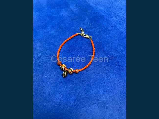 Bracelet composé d'un rang de rocaille orange orné d'un élément central en forme de pomme de pin en métal finition bronze vieilli entouré de 2 perles rondes en agate et de 2 perles rondes en pierre de soleil.
