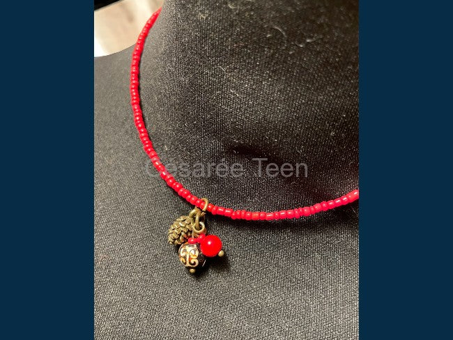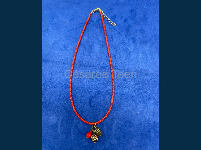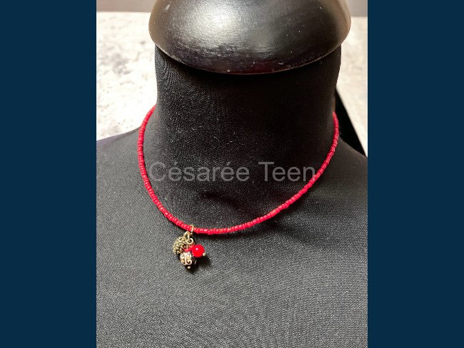 Ras de cou composé d'un rang de rocaille rouge orné d'une grappe avec une pomme de pin en métal finition bronze vieilli, 1 perle ronde en agate et 1 perle ronde en bambou teinté rouge.